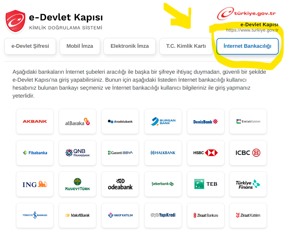 * https://www.turkiye.gov.tr web sayfasına elektronik veya mobil imzanız, internet bankacılığınız veya kimlik kartınızı kullanarak giriş yapınız.